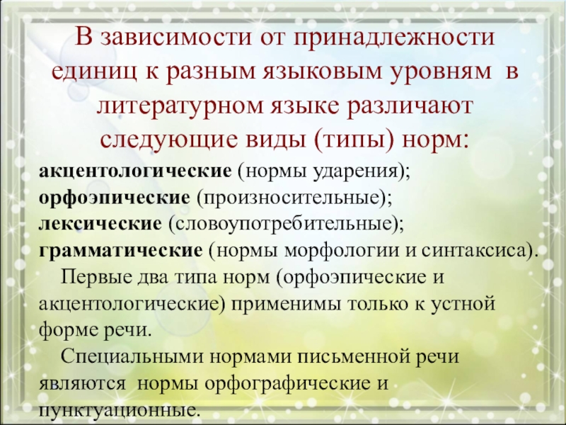 Первые два типа норм (орфоэпические и акцентологические) применимы только к устной форме речи.