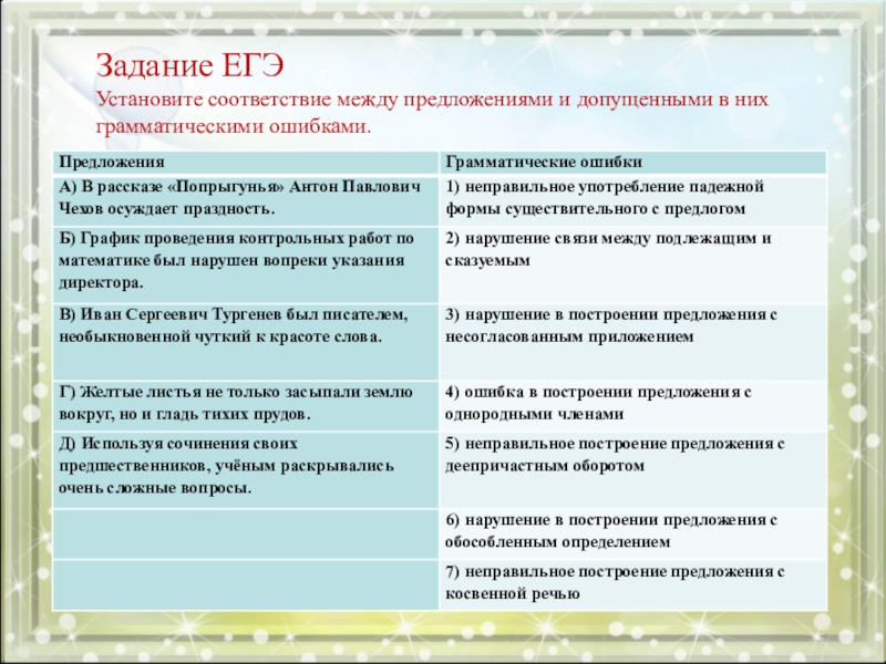 Установите соответствие между предложениями и допущенными в них грамматическими ошибками.