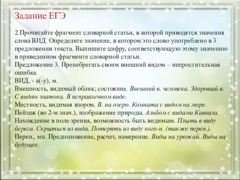 2.Прочитайте фрагмент словарной статьи, в которой приводятся значения слова ВИД.