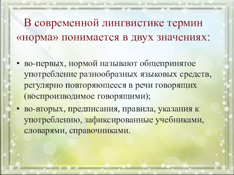 Слайд 4В современной лингвистике термин «норма» понимается в двух значениях: