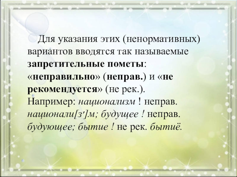 Слайд 10 Для указания этих (ненормативных) вариантов вводятся так называемые запретительные