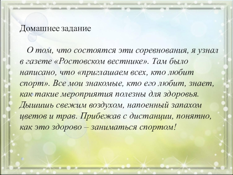 в газете «Ростовском вестнике». Там было написано, что «приглашаем всех, кто любит спорт». Все мои знакомые, кто его любит, знает, как такие мероприятия полезны для здоровья. Дышишь свежим воздухом, напоенный запахом цветов и трав. Прибежав с дистанции, понятно, как это здорово – заниматься спортом!
