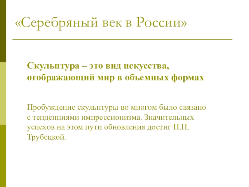 Серебряный век - термин, которым, по сложившейся в русской критике 20 в. традиции, обозначают европейское и русское искусство рубежа 19-20 вв.