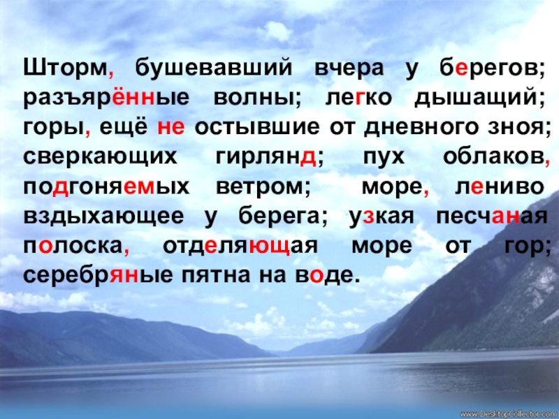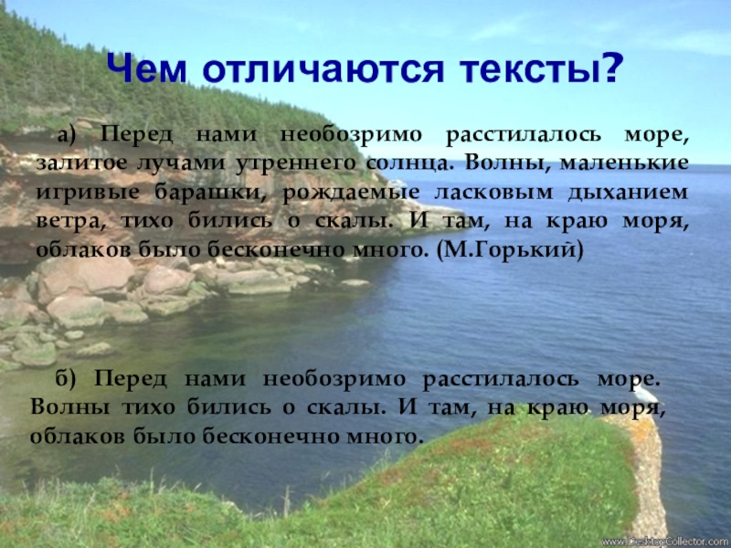 а) Перед нами необозримо расстилалось море, залитое лучами утреннего солнца. Волны, маленькие игривые барашки, рождаемые ласковым дыханием ветра, тихо бились о скалы. И там, на краю моря, облаков было бесконечно много. (М.Горький)