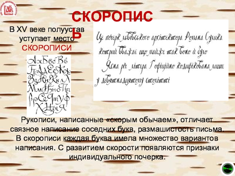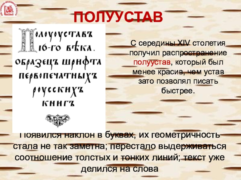 Появился наклон в буквах, их геометричность стала не так заметна; перестало выдерживаться соотношение толстых и тонких линий; текст уже делился на слова