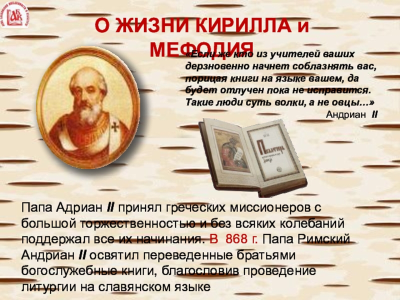 Папа Адриан II принял греческих миссионеров с большой торжественностью и без всяких колебаний поддержал все их начинания. В 868 г. Папа Римский Андриан II освятил переведенные братьями богослужебные книги, благословив проведение литургии на славянском языке