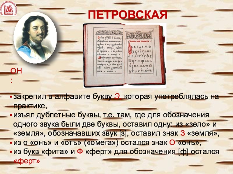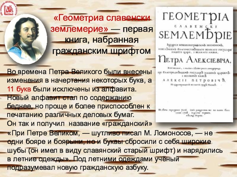 «При Петре Великом, — шутливо писал М. Ломоносов, — не одни бояре и боярыни, но и буквы сбросили с себя широкие шубы (он имел в виду славянский старый шрифт) и нарядились в летние одежды». Под летними одеждами учёный подразумевал новую гражданскую азбуку.