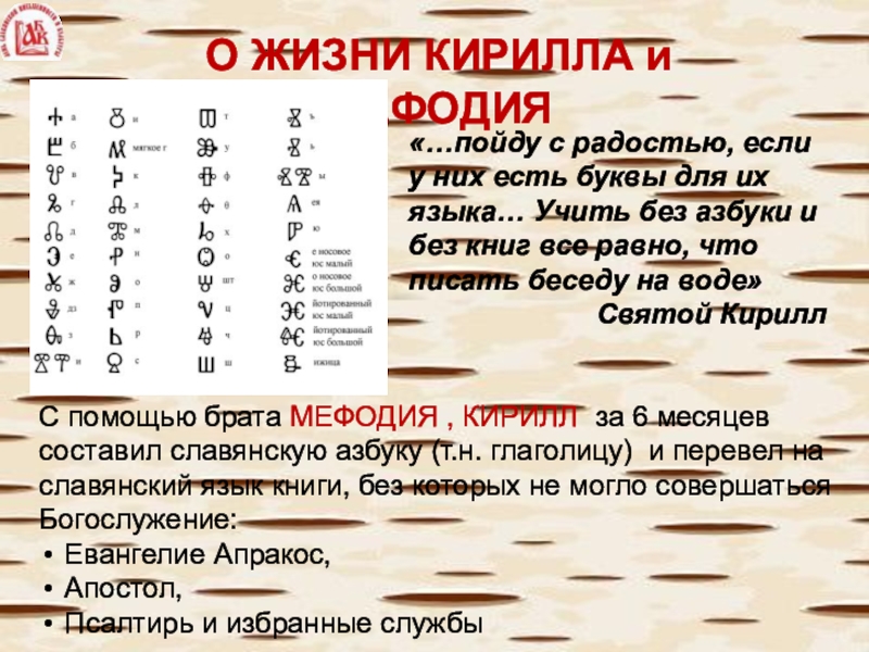 «…пойду с радостью, если у них есть буквы для их языка… Учить без азбуки и без книг все равно, что писать беседу на воде»