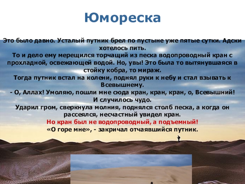 Это было давно. Усталый путник брел по пустыне уже пятые сутки. Адски хотелось пить.