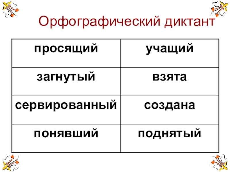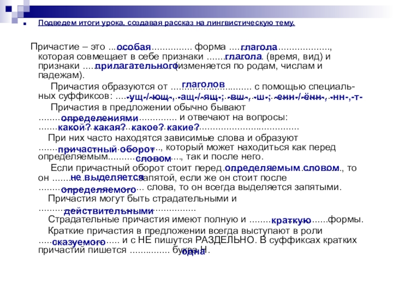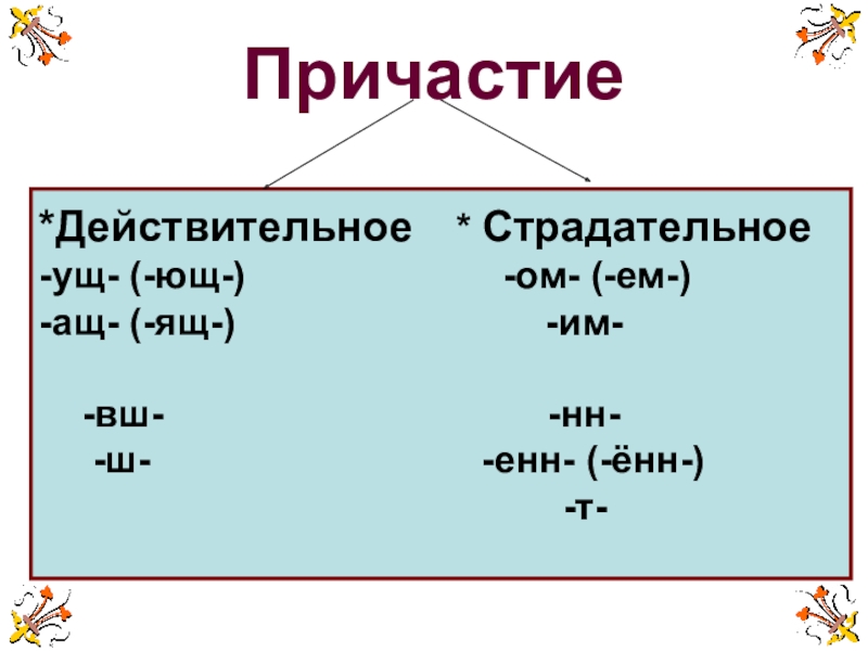 -ущ-/-ющ-, -ащ-/-ящ-; -вш-, -ш-; -енн-/-ённ-, -нн-,-т-