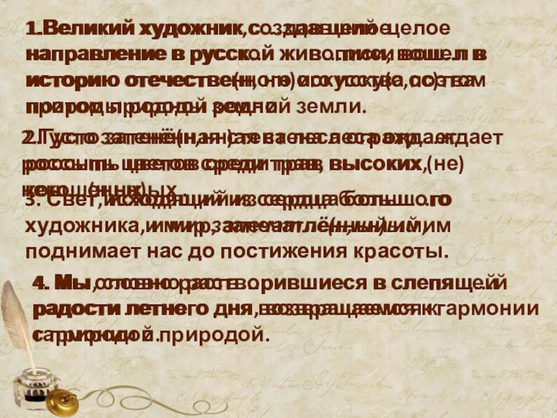 3. Свет исходящий из сердца больш…го художника и мир запечатлё(н,нн)ый им поднимает нас до постижения красоты.