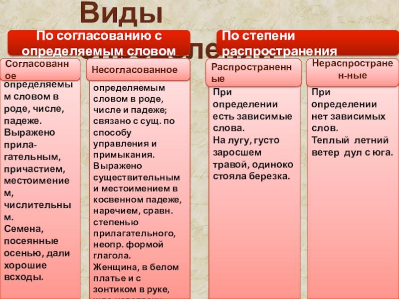 определяемым словом в роде, числе и падеже; связано с сущ. по способу управления и примыкания.