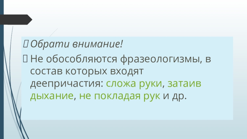 Обрати внимание!Не обособляются фразеологизмы, в состав которых входят деепричастия: сложа руки, затаив дыхание, не покладая рук и др.