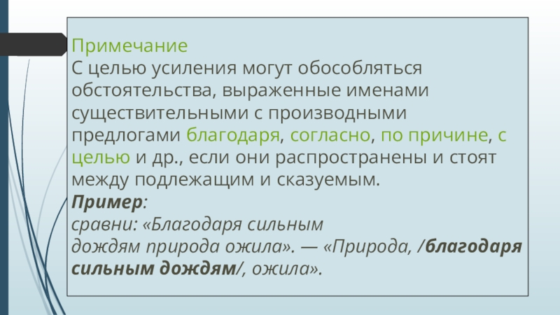 ПримечаниеС целью усиления могут обособляться обстоятельства, выраженные именами существительными с производными предлогами благодаря, согласно, по причине, с целью и др., если они