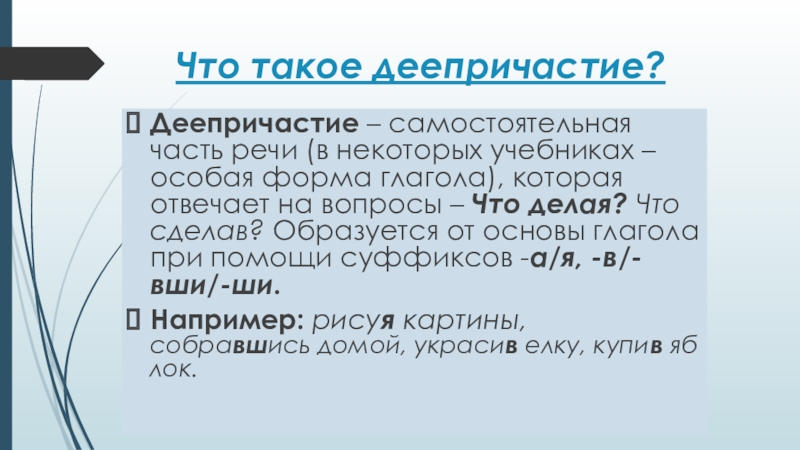 Что такое деепричастие?Деепричастие – самостоятельная часть речи (в некоторых учебниках – особая форма глагола), которая отвечает на вопросы – Что делая? Что сделав? Образуется от основы глагола при помощи суффиксов -а/я, -в/-вши/-ши.Например: рисуя картины, собравшись домой, украсив елку, купив яблок.