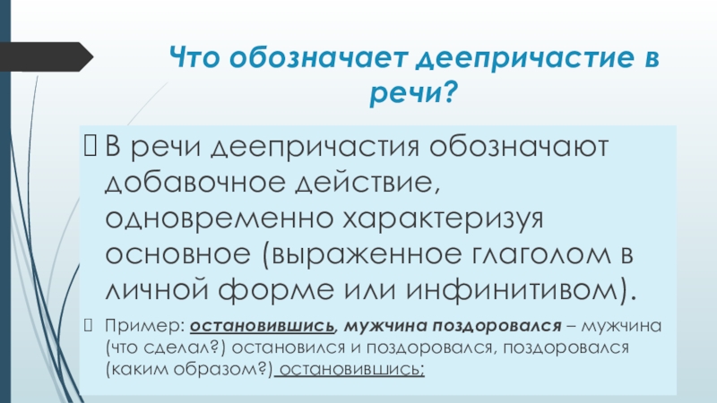 Пример: остановившись, мужчина поздоровался – мужчина (что сделал?) остановился и поздоровался, поздоровался (каким образом?) остановившись;