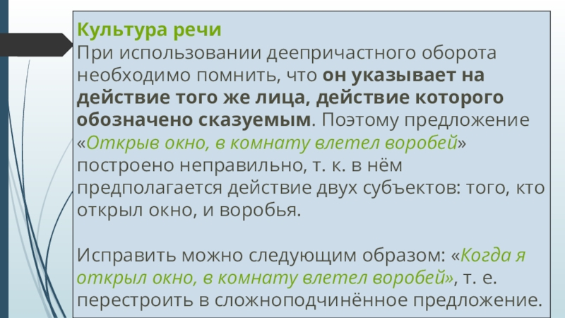 действие того же лица, действие которого обозначено сказуемым. Поэтому предложение «Открыв окно, в комнату влетел воробей» построено неправильно, т. к. в нём предполагается действие двух субъектов: того, кто открыл окно, и воробья.