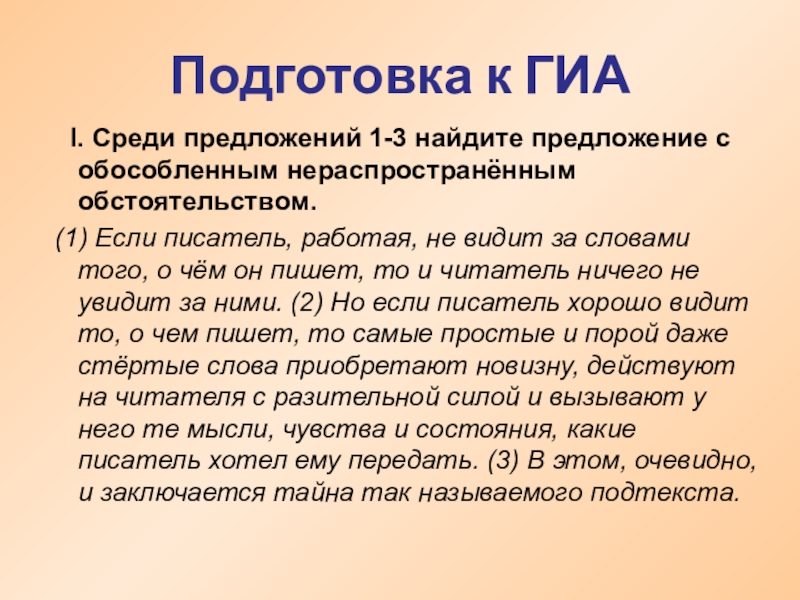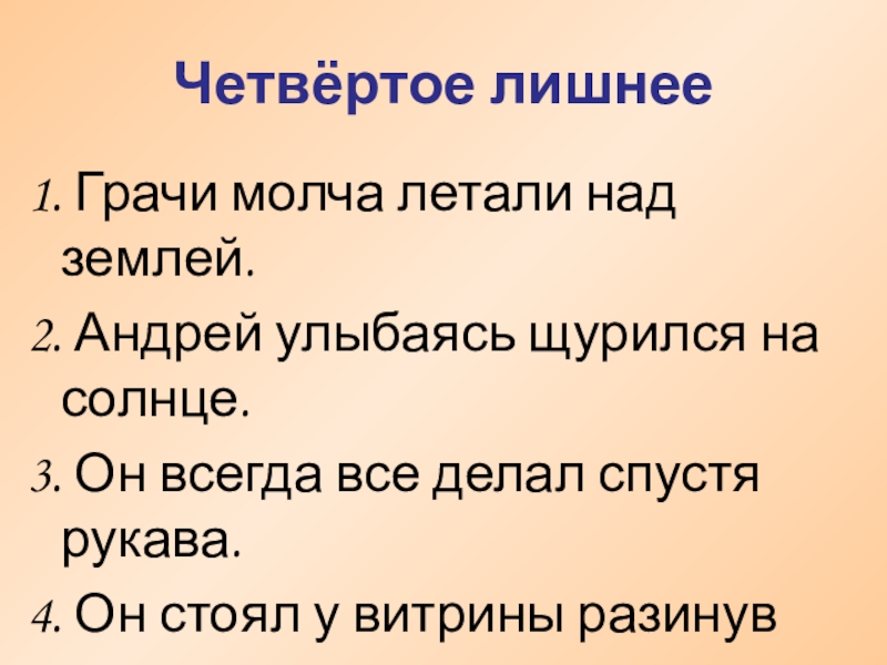 2. Наречия стоя, лежа, молча, нехотя, шутя, не глядя и др.
