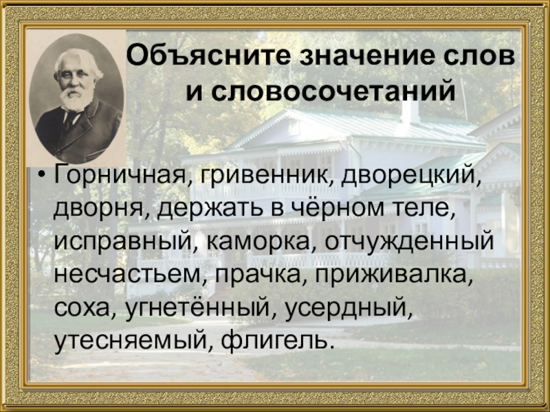 Объясните значение слов и словосочетанийГорничная, гривенник, дворецкий, дворня, держать в чёрном теле, исправный, каморка, отчужденный несчастьем, прачка, приживалка, соха, угнетённый, усердный, утесняемый, флигель.