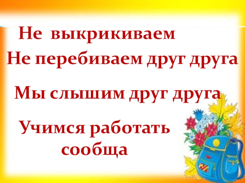 Не выкрикиваемНе перебиваем друг другаМы слышим друг другаУчимся работать сообща