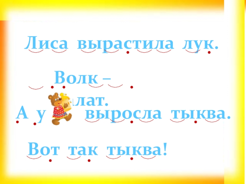 Лиса вырастила лук.Волк – салат.А у     выросла тыква.Вот так тыква!