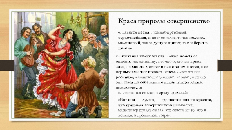 «…цыганка ходит этакая... даже нельзя ее описать как женщину, а точно будто как яркая змея, на хвосте движет и вся станом гнется, а из черных глаз так и жжет огнем. …вот этакие ресницы, длинные-предлинные, черные, и точно они сами по себе живые и, как птицы какие, шевелятся…»