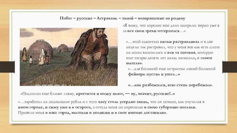 «…тосковал: очень домой в Россию хотелось… вспомнишь крещеную землю и заплачешь. ..и молишься... так молишься, что даже снег инда под коленами протает и где слезы падали — утром травку увидишь».