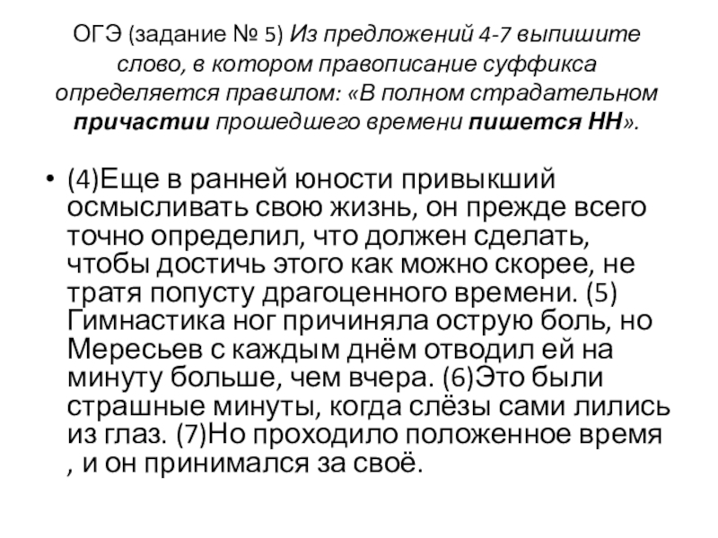 (4)Еще в ранней юности привыкший осмысливать свою жизнь, он прежде всего точно определил, что должен сделать, чтобы достичь этого как можно скорее, не тратя попусту драгоценного времени. (5)Гимнастика ног причиняла острую боль, но Мересьев с каждым днём отводил ей на минуту больше, чем вчера. (6)Это были страшные минуты, когда слёзы сами лились из глаз. (7)Но проходило положенное время , и он принимался за своё.