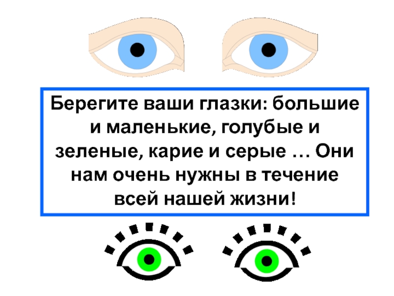 Слайд 11Берегите ваши глазки: большие и маленькие, голубые и зеленые, карие и