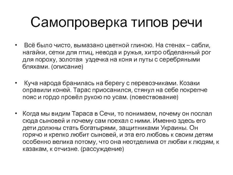 Самопроверка типов речи Всё было чисто, вымазано цветной глиною. На стенах – сабли, нагайки, сетки для птиц, невода и ружья, хитро обделанный рог для пороху, золотая уздечка на коня и путы с серебряными бляхами. (описание) Куча