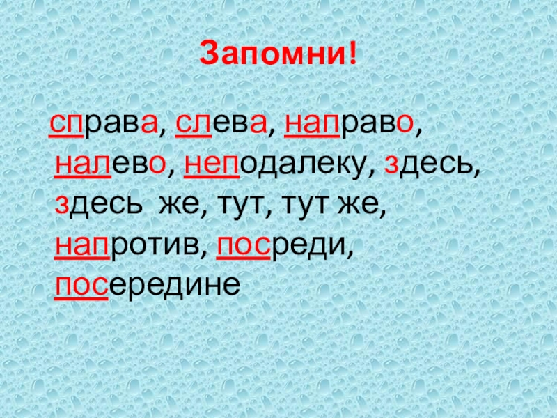 Запомни!   справа, слева, направо, налево, неподалеку, здесь, здесь же, тут, тут же, напротив, посреди, посередине