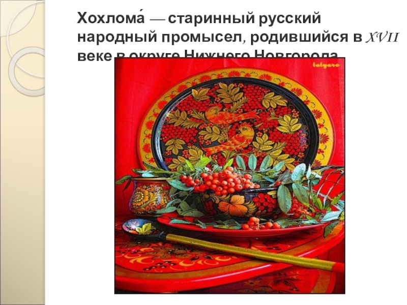 Слайд 2Хохлома́ — старинный русский народный промысел, родившийся в XVII веке в