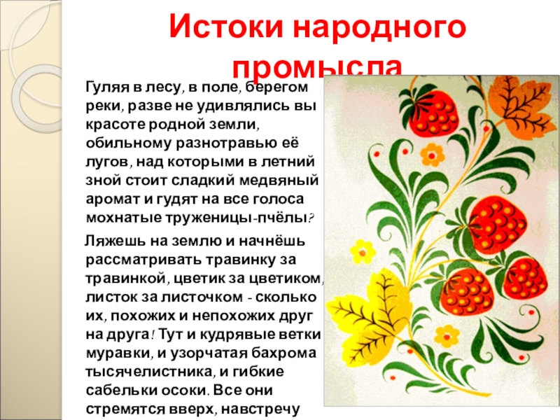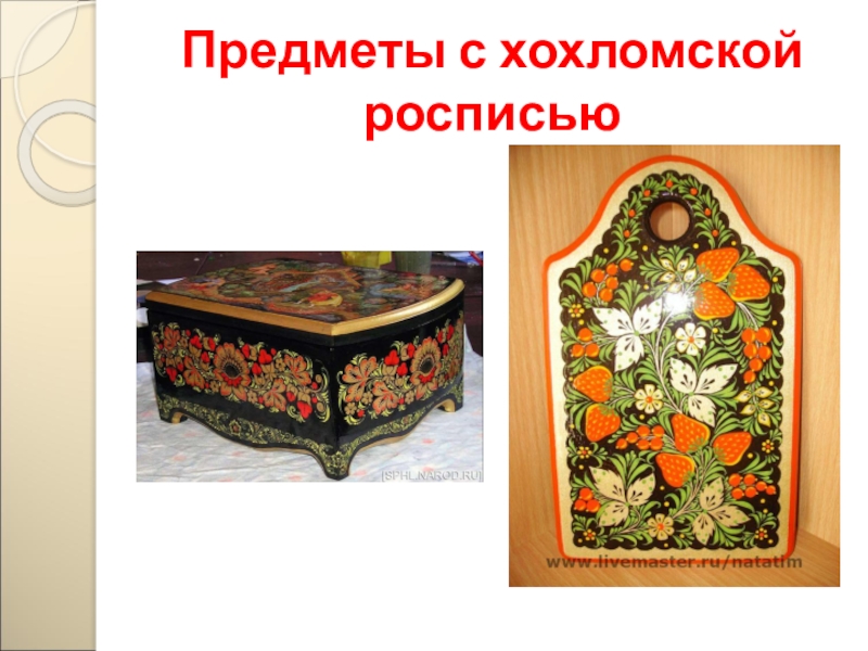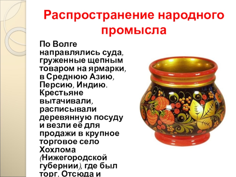 в Среднюю Азию, Персию, Индию. Крестьяне вытачивали, расписывали деревянную посуду и везли её для продажи в крупное торговое село Хохлома (Нижегородской губернии), где был торг. Отсюда и пошло название «хохломская роспись», или просто «хохлома».