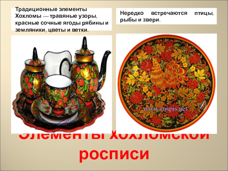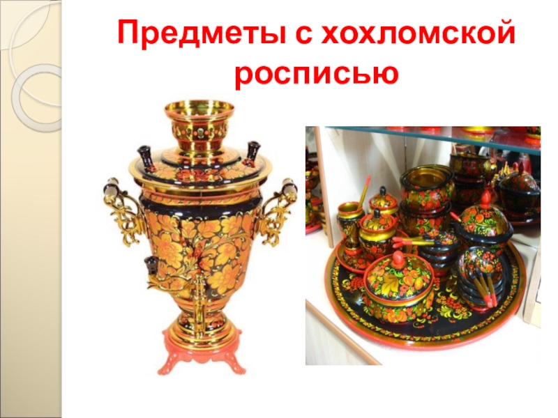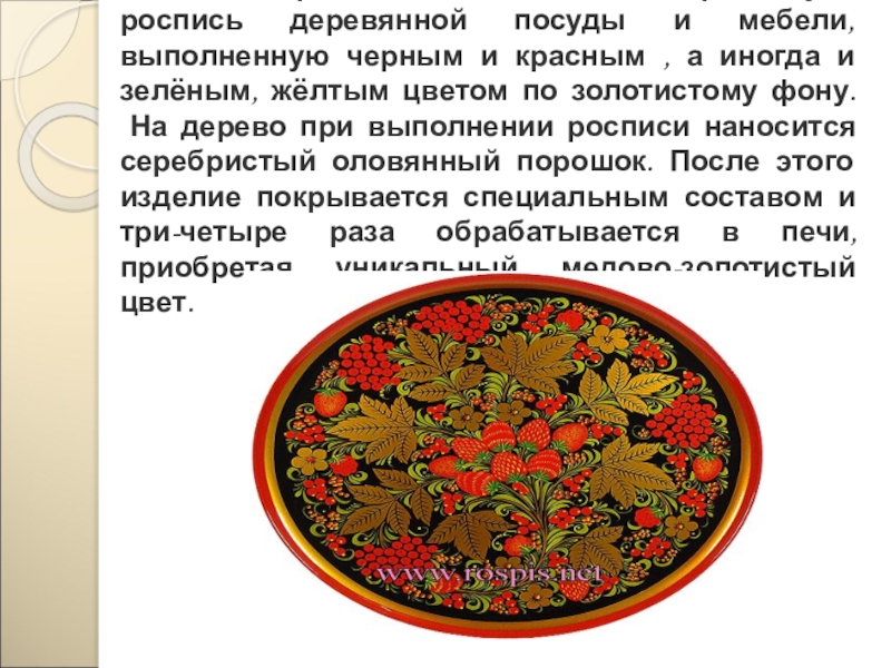 Слайд 3Хохлома представляет собой декоративную роспись деревянной посуды и мебели, выполненную черным