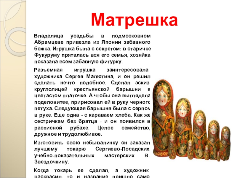 Разъемная игрушка заинтересовала художника Сергея Малютина, и он решил сделать нечто подобное. Сделал эскиз круглолицей крестьянской барышни в цветастом платочке. А чтобы она выглядела поделовитее, пририсовал ей в руку черного петуха. Следующая барышня была с серпом в руке. Еще одна - с караваем хлеба. Как же сестричкам без братца - и он появился в расписной рубахе. Целое семейство, дружное и трудолюбивое.