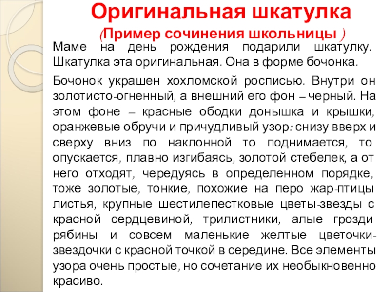 Бочонок украшен хохломской росписью. Внутри он золотисто-огненный, а внешний его фон – черный. На этом фоне – красные ободки донышка и крышки, оранжевые обручи и причудливый узор: снизу вверх и сверху вниз по наклонной то поднимается, то опускается, плавно изгибаясь, золотой стебелек, а от него отходят, чередуясь в определенном порядке, тоже золотые, тонкие, похожие на перо жар-птицы листья, крупные шестилепестковые цветы-звезды с красной сердцевиной, трилистники, алые грозди рябины и совсем маленькие желтые цветочки-звездочки с красной точкой в середине. Все элементы узора очень простые, но сочетание их необыкновенно красиво.