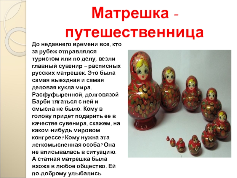 или по делу, везли главный сувенир – расписных русских матрешек. Это была самая выездная и самая деловая кукла мира. Расфуфыренной, долговязой Барби тягаться с ней и смысла не было. Кому в голову придет подарить ее в качестве сувенира, скажем, на каком-нибудь мировом конгрессе? Кому нужна эта легкомысленная особа? Она не вписывалась в ситуацию. А статная матрешка была вхожа в любое общество. Ей по-доброму улыбались короли и королевы, принцы и принцессы, президенты, генералы и адмиралы, звезды кино, а уж о детишках и говорить нечего.