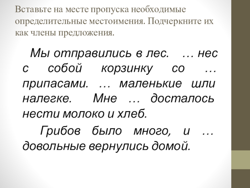 Мы отправились в лес. … нес с собой корзинку со … припасами. … маленькие шли налегке. Мне … досталось нести молоко и хлеб.