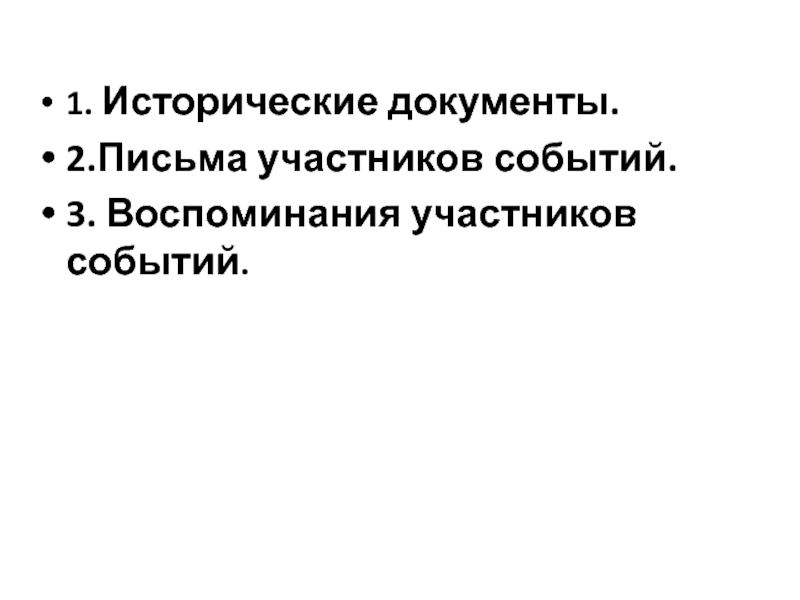 1. Исторические документы.2.Письма участников событий.3. Воспоминания участников событий.