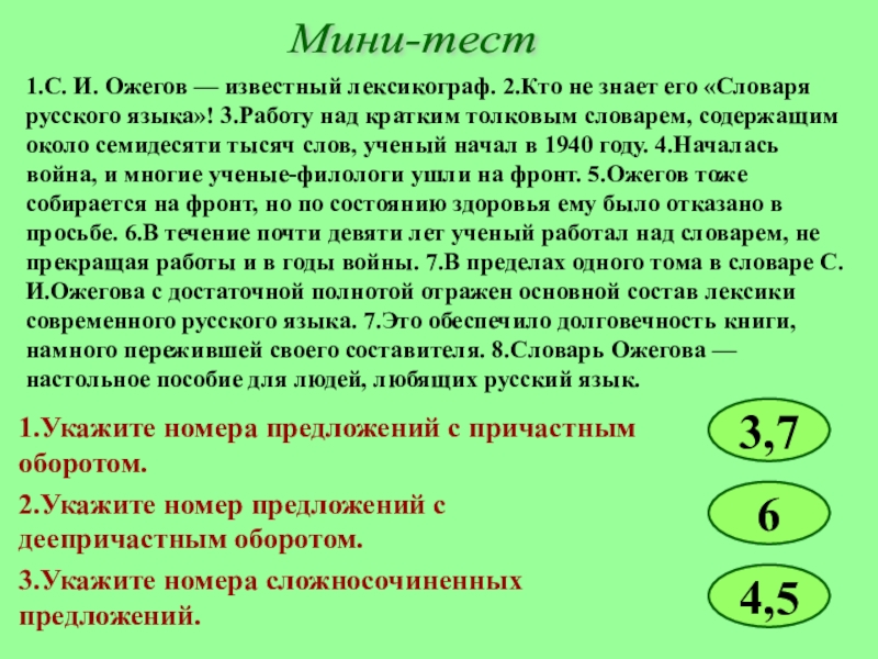 1.Укажите номера предложений с причастным оборотом.