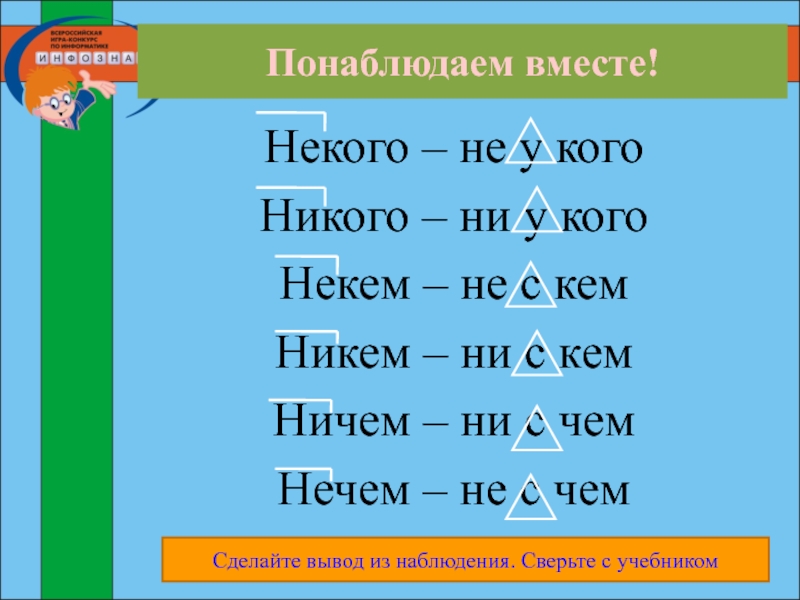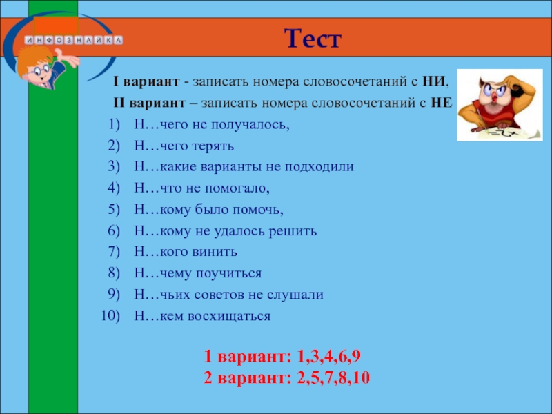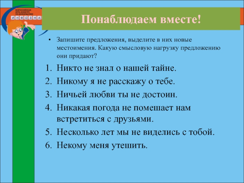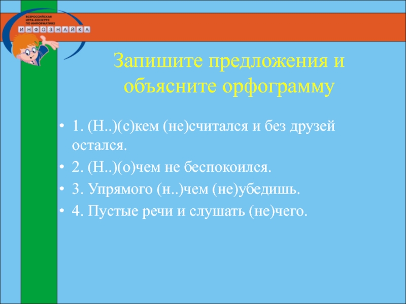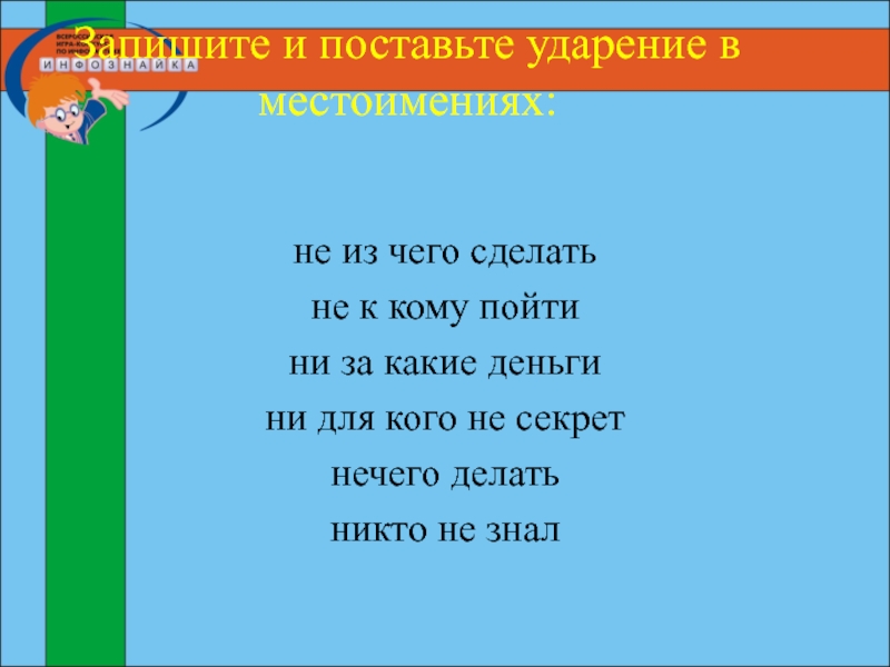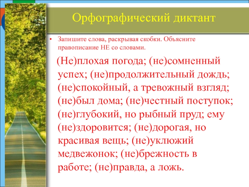 (Не)плохая погода; (не)сомненный успех; (не)продолжительный дождь; (не)спокойный, а тревожный взгляд; (не)был дома; (не)честный поступок; (не)глубокий, но рыбный пруд; ему (не)здоровится; (не)дорогая, но красивая вещь; (не)уклюжий медвежонок; (не)брежность в работе; (не)правда, а ложь.