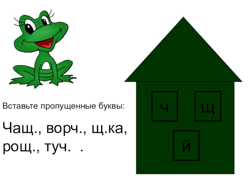 чщйВставьте пропущенные буквы:Чащ., ворч., щ.ка, рощ., туч. .