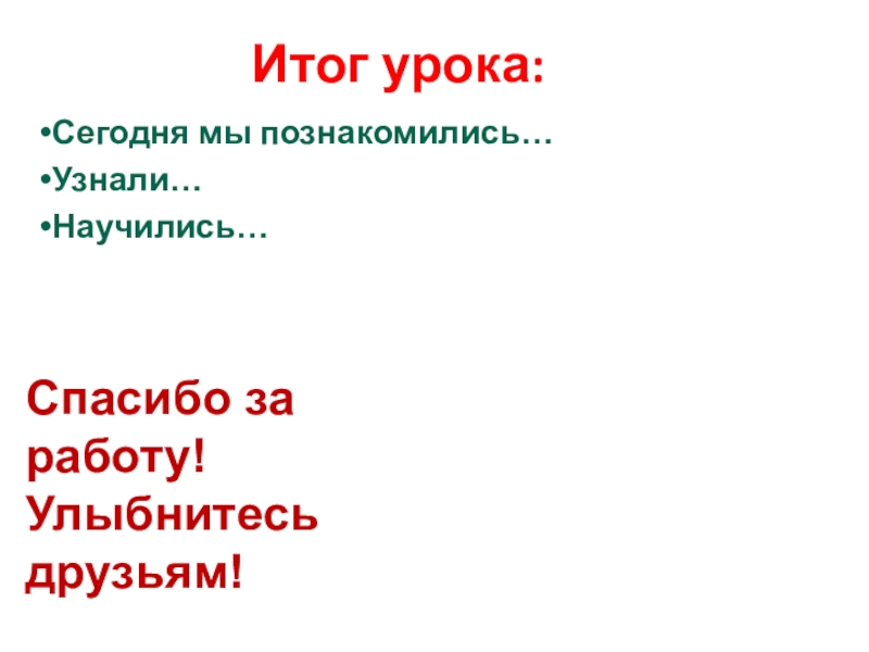 Итог урока:Сегодня мы познакомились…Узнали…Научились…Спасибо за работу! Улыбнитесь друзьям!