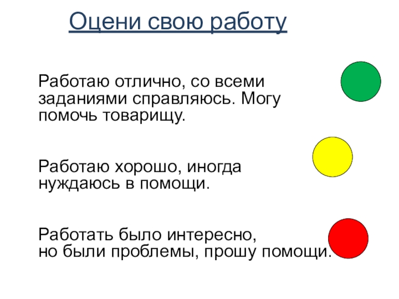 Оцени свою работу Работаю отлично, со всеми заданиями справляюсь. Могу помочь товарищу.Работаю хорошо, иногда нуждаюсь в помощи.Работать