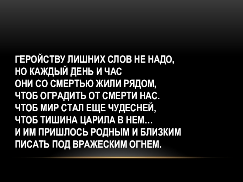 жили рядом, Чтоб оградить от смерти нас. Чтоб мир стал еще чудесней, Чтоб тишина царила в нем… И им пришлось родным и близким Писать под вражеским огнем.