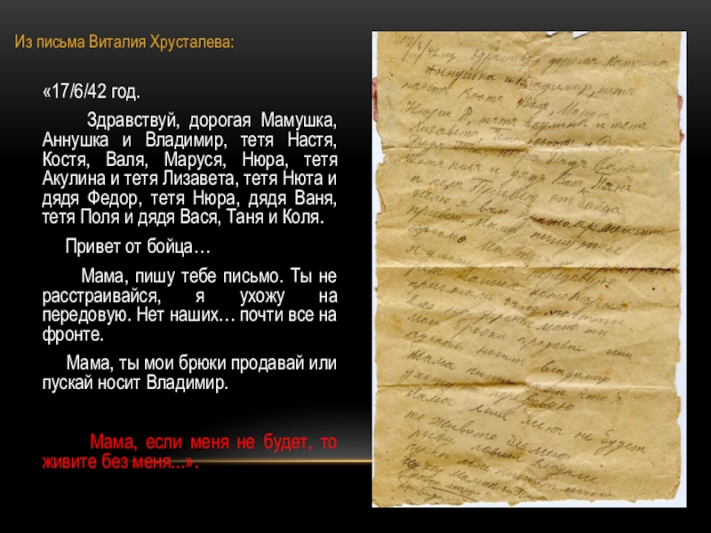Из письма Виталия Хрусталева: «17/6/42 год.    Здравствуй, дорогая Мамушка, Аннушка и Владимир, тетя Настя, Костя,