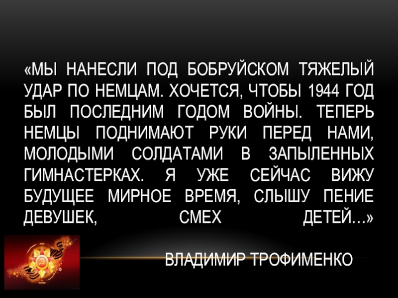 год был последним годом войны. Теперь немцы поднимают руки перед нами, молодыми солдатами в запыленных гимнастерках. Я уже сейчас вижу будущее мирное время, слышу пение девушек, смех детей…» Владимир Трофименко