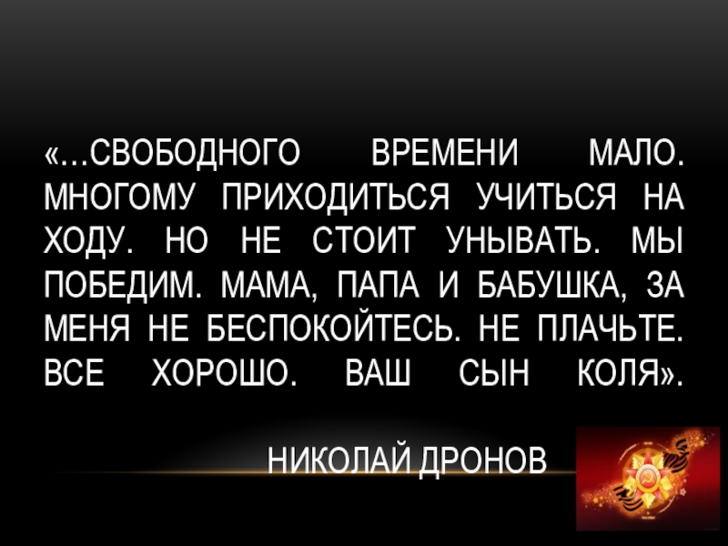 унывать. Мы победим. Мама, папа и бабушка, за меня не беспокойтесь. Не плачьте. Все хорошо. Ваш сын Коля». Николай Дронов