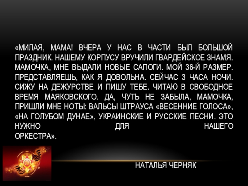корпусу вручили Гвардейское знамя. Мамочка, мне выдали новые сапоги. Мой 36-й размер. Представляешь, как я довольна. Сейчас 3 часа ночи. Сижу на дежурстве и пишу тебе. Читаю в свободное время Маяковского. Да, чуть не забыла, мамочка, пришли мне ноты: вальсы Штрауса «Весенние голоса», «На голубом Дунае», украинские и русские песни. Это нужно для нашего оркестра». Наталья Черняк