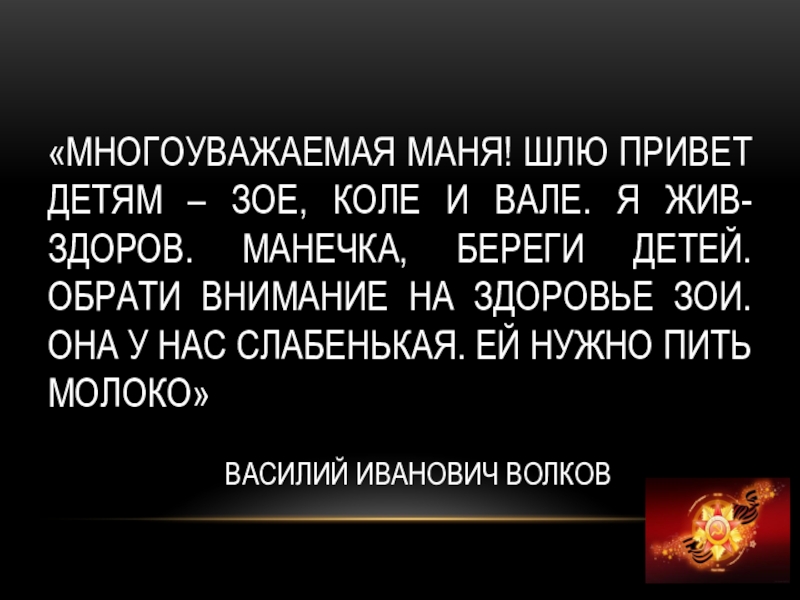 жив-здоров. Манечка, береги детей. Обрати внимание на здоровье Зои. Она у нас слабенькая. Ей нужно пить молоко» Василий Иванович Волков